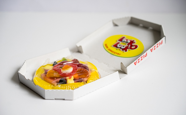 Im handelsüblichen Pizza-Pappkarton kommt die Candy-Pizza. Diese besteht aus unterschiedlichen Fruchtgummisorten. Diese süße Pizza aus Weingummi eignet sich toll zum verschenken finden wir. Eine wirklich tolle Idee.