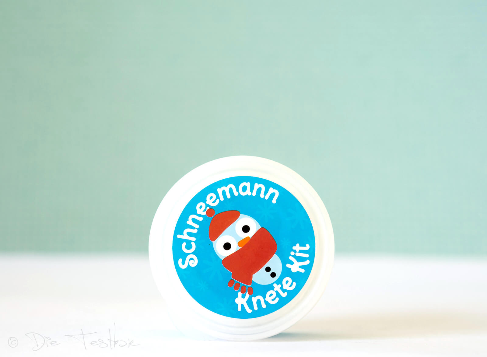 Süßes Schneemann Bastelset in der Box: Mini Schneemann zusammen kneten und mit Augen, Armen und Möhren-Nase ausstatten. Fertig und schmilzt nicht!