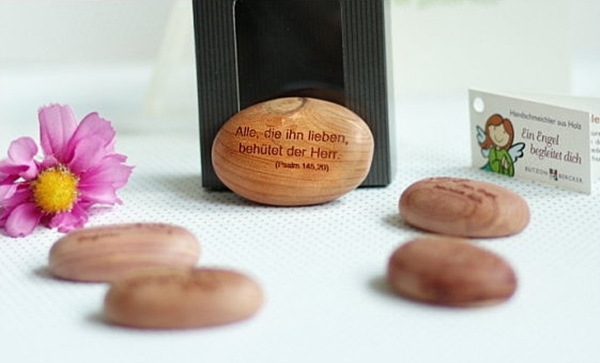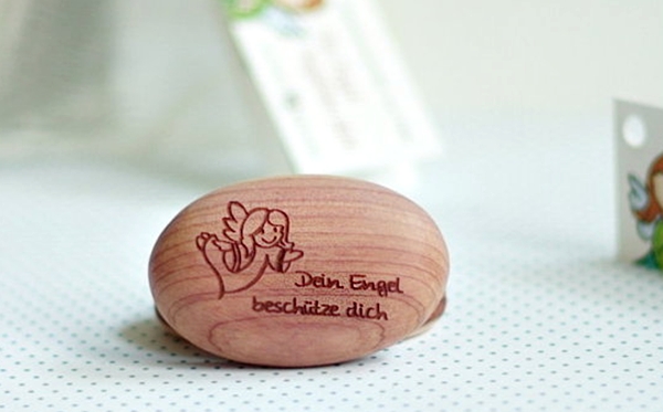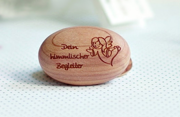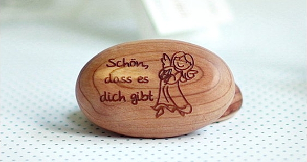 Der Handschmeichler wurde Lebensbaumholz gefertigt mit Text und Engelmotiv