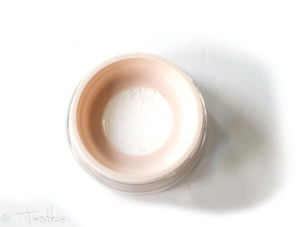 Das Puder kommt in einer hübschen Kunststoffdose mit einem goldfarbenen Deckel. Öffnet man die Dose, erblickt man im inneren eine Art Netz unter dem sich das Ruder befindet. Wenn man mit dem Finger leicht auf das Netz tippt poppt das Puder hoch und man kann es entnehmen. Das ist echt praktisch.