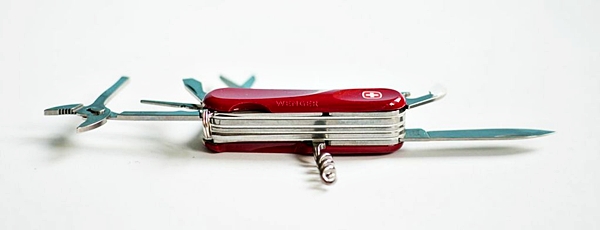 Werkzeuge: Ahle, Dosenöffner, Klinge, Korkenzieher, Lupe, Nagelfeile, Pinzette, Schere, Schlitzschraubendreher mit integriertem Kapselheber, Säge und Zahnstocher.