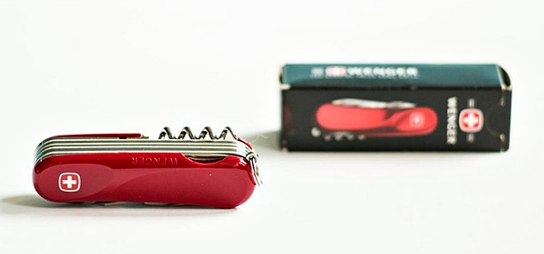 Das Wenger Schweizer Taschenmesser bietet ein sicheres Handling. Die Klinge wird nach dem Öffnen festgestellt und erst durch einen Hebeldruck wird die Arretierung gelöst.